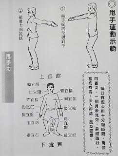 (四)開始甩手, 虛上, 用力在四十五度之下, 兩腕和臂向後翻, 同時開始數數, 切記出手用七分力, 回手用三分力, 同時翻掌朝天, 胸肺得以擴張。